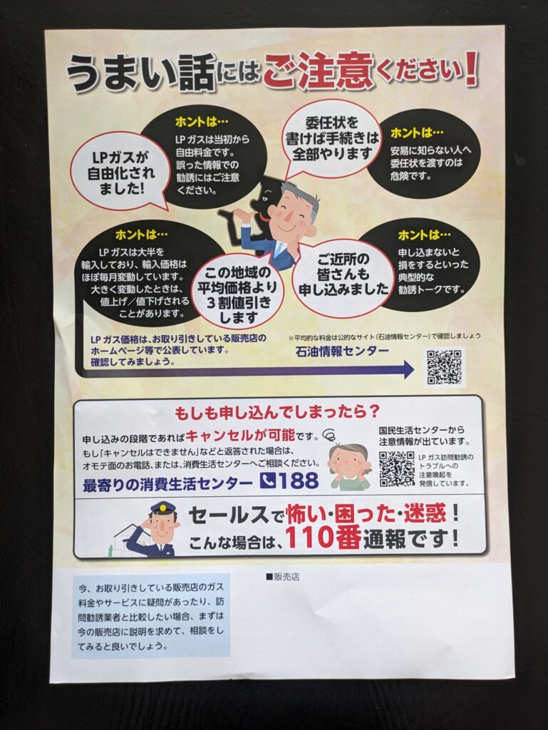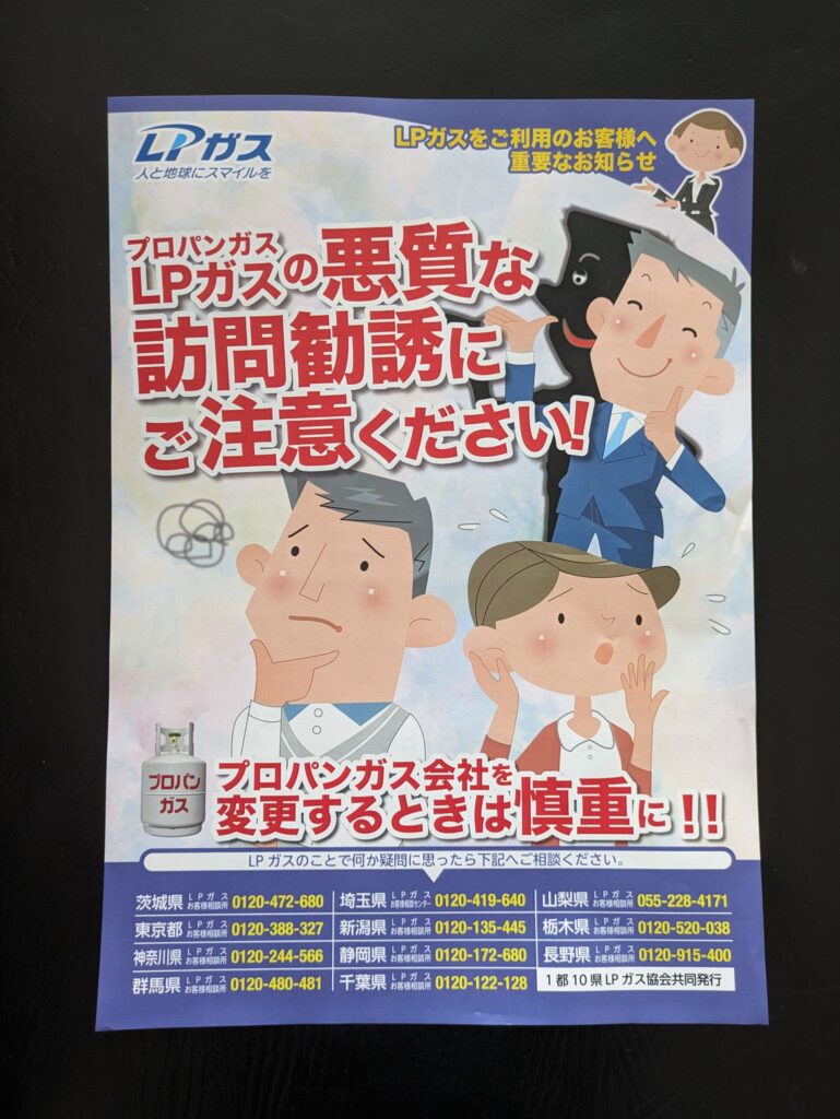 2024-07-06 / 最終更新日時 : 2024-12-28 fukase ニュース 身近なトラブル増えてます!ご注意下さい 「今より安いガス料金になりますよ」 「安い料金の販売店を紹介しますよ」 「ガスの料金調査に参りました」 などと、甘い言葉や目的を偽ってLPガス販売店の切り替えを勧誘する営業が近年増えています。 LPガス協会共同発行チラシ 大変に大きなトラブルに発展してしまうことがあります。このため、神奈川県警察署では、 「賢い選択で、悪質な業者とのトラブルを防止しましょう!」 と注意を呼びかけています。 \ 最新情報をチェック / FacebookXBlueskyHatenaCopy